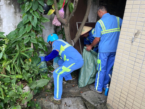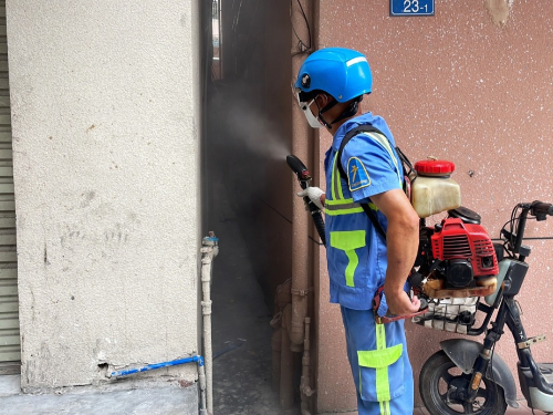 凤凰街道环卫部门在城中村内巷蚊虫孳生区域进行药剂喷洒消杀