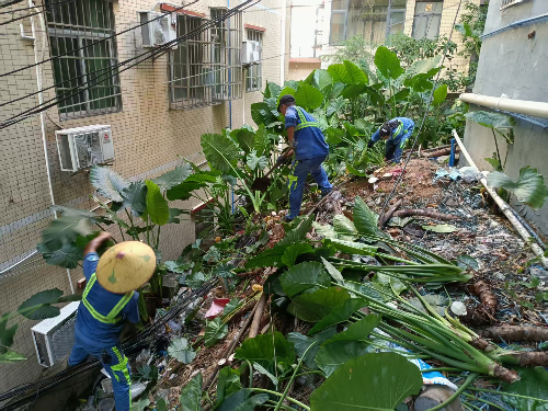 环卫工人对城中村房前屋后的杂乱植物和杂草进行砍伐清理