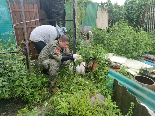 在此次行动中,基干民兵们通过无人机发现并记录了多处楼顶存在花盆积水、废弃容器积水以及杂物长期堆积的情况。随后,民兵们协同社区工作人员,迅速前往问题点位,对积水进行倾倒清理,对杂物进行分类清运,并同步开展蚊虫消杀工作,从源头上遏制蚊虫滋生,有效降低“两热”传播风险。