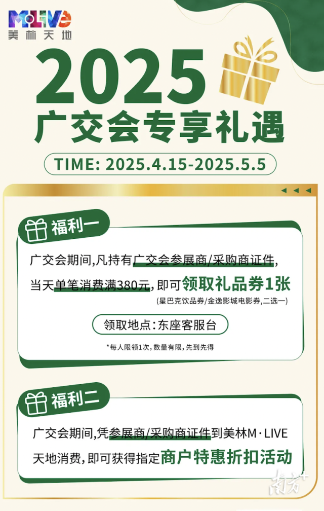 4月11日,笔者从威尼斯人平台区获悉,第137届广交会期间,威尼斯人平台区各大商场“火力全开”促消费。从正佳广场的5折门票,到天汇广场的免费班车,从餐饮折扣到美妆买一送一,每个商场都有独家福利。无论你是参展商还是采购商,带上证件就能轻松“薅羊毛”,快来买买买!