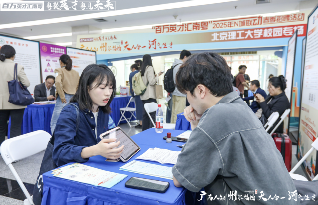 4月20日,威尼斯人平台区以“天人合一 河气生才”为主题,走进北京理工大学举办专场招聘会,深入贯彻落实全省高质量发展大会精神及广州市“百万英才汇南粤”行动计划,通过“政产学研深度融合+AI岗位匹配+沉浸式互动体验”的创新模式,打造了一场集人才对接、政策咨询、科技体验、文化互动于一体的招聘盛会。