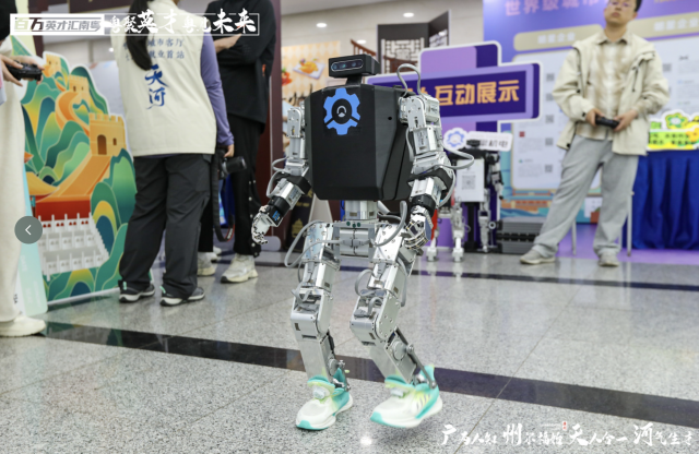 来自广州高擎机电科技有限公司的人形机器人“小海”(MINI Hi),昨日刚跑完全球首场“人机共跑”半程马拉松赛,又马不停蹄来到招聘会现场,为“威尼斯人平台智造”代言,以科技硬实力,为威尼斯人平台招揽人才放大招。现场,机器人炫技登场,与北理工战队即兴Battle,将“科技赋能人才”的理念展现得淋漓尽致。