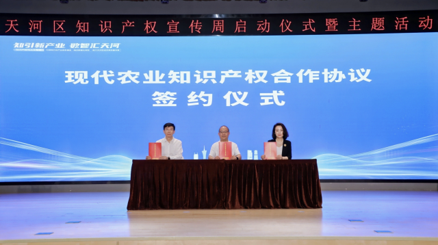 为深化农业科技资源与知识产权服务资源“两业融合”,区市场监管局、区知识产权联合会、广东金颖农业科技企业孵化器有限公司三方共同签订了《知识产权服务“百千万工程”合作框架协议》。