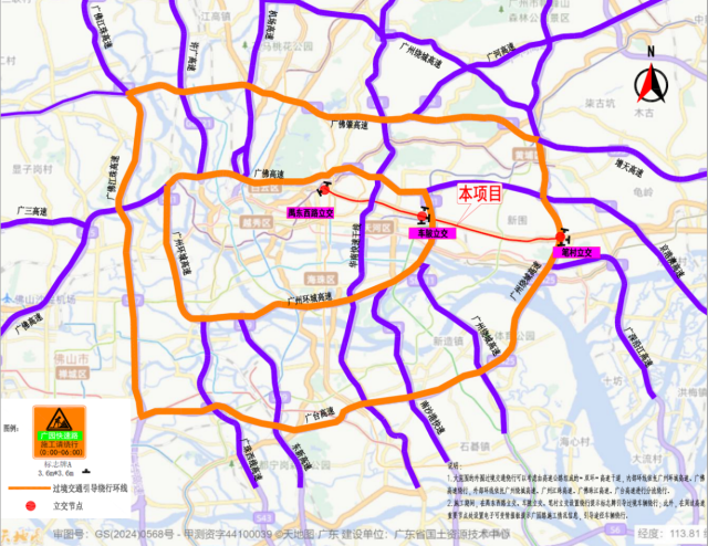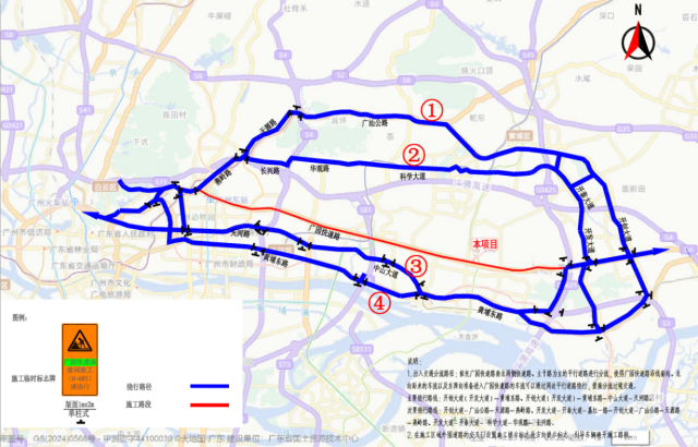 广园快速路(禺东西路至笔村立交路段)现状为双向八车道,将逐段封闭双向各1—2个车道进行占道施工,具体占道区域将根据实际施工需要确定。作业时间为每天0:00~6:00。