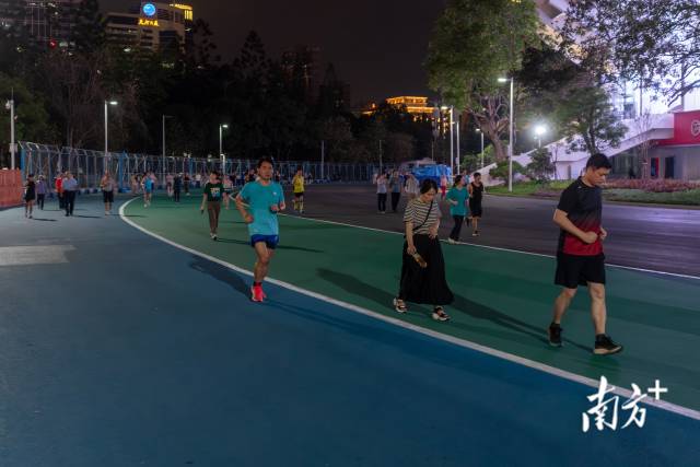 跑步爱好者李女士告诉记者,她每周二、周四都会到天体参与跑团的训练。“这里氛围特别好,周边的环境也很好,能看到广州最繁华的地方,跑起来让人心情愉悦!训练之后,我们跑团常常会去周围吃宵夜。”