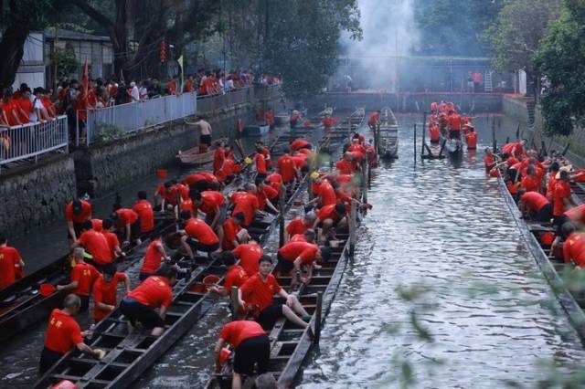 在雄浑有力的龙船鼓声和村民群众“石牌精神,拼搏过人”的加油声中,在过百位桡手合力之下,各条龙舟陆续“出水”,“起龙”仪式正式完成。