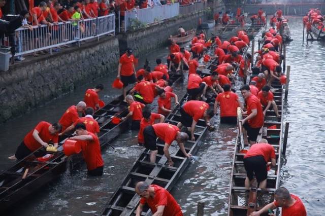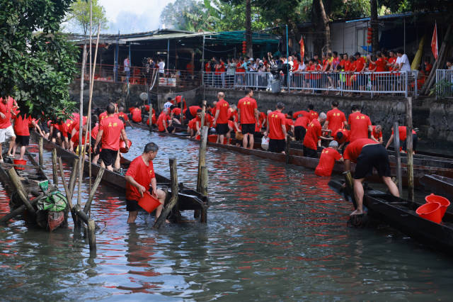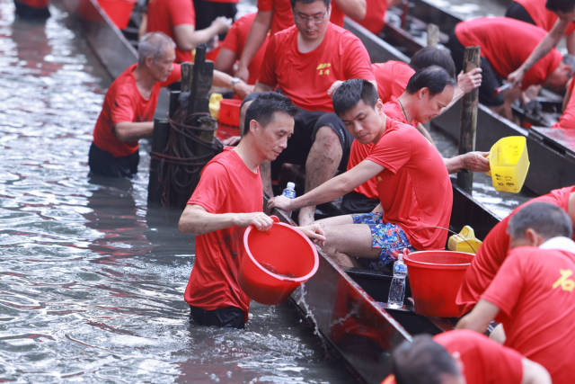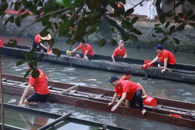 在龙舟上用力摇松船底泥浆的潘同学今年大一,“好开心,今天没有课就报名过来了,以前要上学都参与不了起龙活动”。旁边用水桶将船舱内积压泥沙掏出的冼同学笑道:“今年我满18岁了,可以扒龙船啦。”这些“新扎桡手”将成为端午竞渡的生力军。