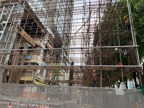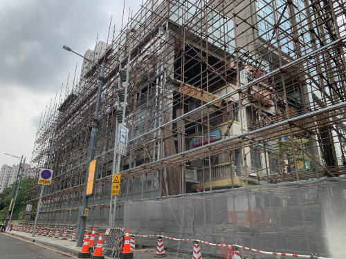 记者现场看到,“文和友”外围被脚手架围蔽,招牌和建筑外立面仍没拆除。围蔽范围覆盖汇坊区域,不少工人在施工,现场还出动了小型的施工升降机,运送建筑材料,并且拆卸物料。