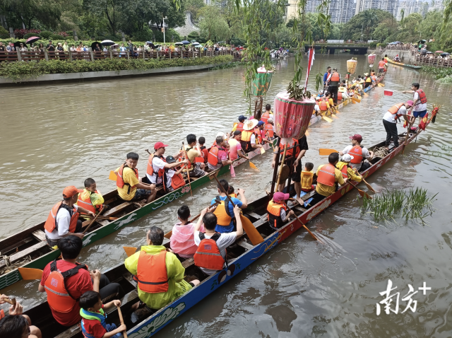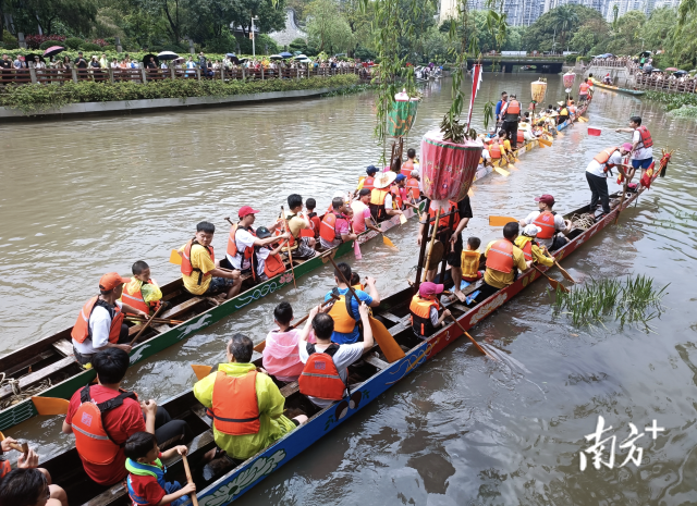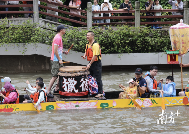 采青后,村民正式游龙。亲子游龙,在猎德也历史悠久。现场,小朋友在大人的带领下,手持小木桡,身披雨衣,在龙船上划水的姿势有模有样。