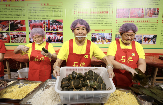 清晨5时,石牌村巧手们已经忙碌起来,提前准备糯米、粽叶、红豆馅、去皮绿豆、瑶柱、咸蛋黄和腌好的猪肉等裹粽所需的各种材料。活动开始后,巧手们围坐在一起,纷纷使出看家本领,捋粽叶、做斗角、填糯米、包馅料、捆水草……动作一气呵成、行云流水。