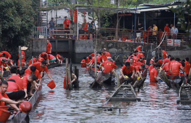 村民群众早早来到涌边,为停靠在岸边的7条龙船精心“扮靓”。