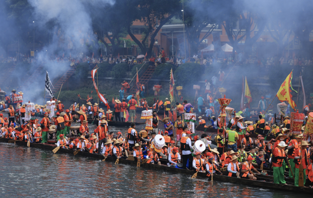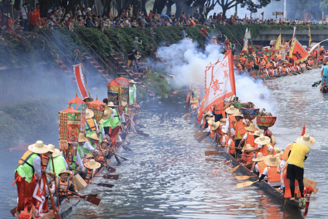 霎时间,新涌成了流动的彩带,各村龙船都精心打扮,旗帜招展,罗伞华美,彩服夺目。桡手们奋力划船,鼓手打起花式鼓点,鞭炮手把鞭炮“烧”得烟雾弥漫,震耳欲聋。呐喊声、鞭炮声、锣鼓声交织在一起,汇成欢迎的交响乐。