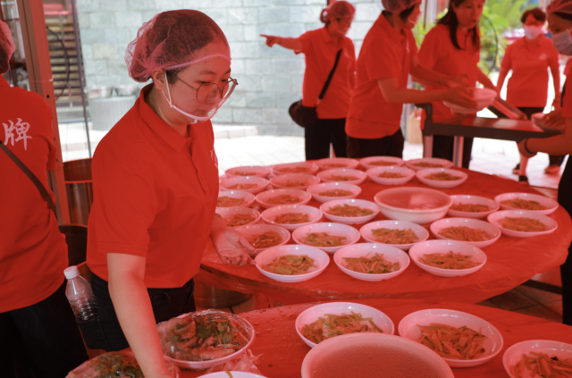 石牌新涌边的安居房广场上,家嫂与大厨们各司其职:清洗果蔬的水声哗哗,切菜斩料的当当声,铁锅翻炒的滋滋声此起彼伏。一条条白鳝在秘制豉油中盘成同心圆,一碟碟萝卜酸码成塔状,一粒粒龙船丁切得方方又正正……“我们石牌的香芋扣肉,出锅撒这一小撮白糖是灵魂,味道对了人情才真嘛。”大厨安哥一边掌勺,一边向年轻家嫂传授石牌美食秘诀。