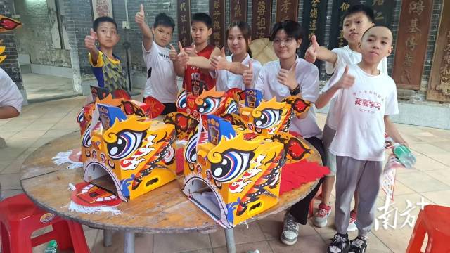 实操课上,简易版狮头一戴上,小小“醒狮少年”立刻上线,跟着节奏摇头摆尾,一场迷你汇演热闹登场,童趣中满是对传统文化的热爱。此外,学生们还一起走访龙狮传承人、听他们讲述与醒狮的故事,孩子们懂得了“传承”二字的重量。