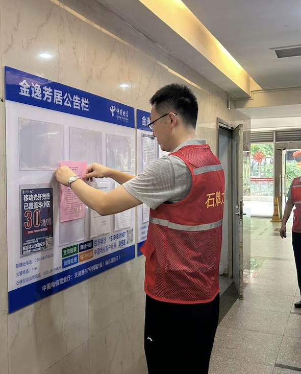 冠军社区双线开展“两热”防控宣传,线上通过社区居民微信群转发预防“两热”倡议书,线下在小区各楼梯口张贴石牌街道《关于预防基孔肯雅热致居民的一封信》,同时联合在职党员、志愿者、物业管理方等加强卫生清洁,做好防蚊措施。
