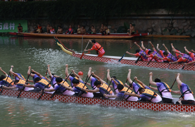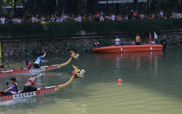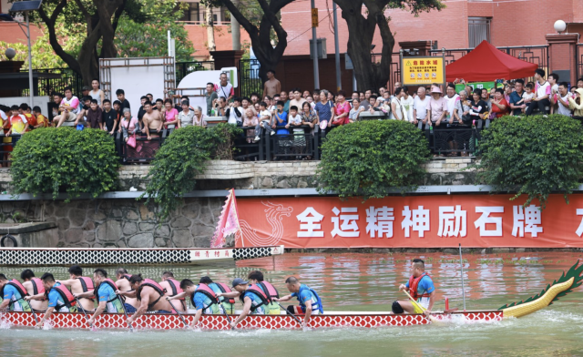 水花飞溅间,是力量与耐力的双重较量,健儿们将龙舟竞渡的力量、速度与协作之美展现得淋漓尽致。岸边观赛群众热情高涨,为自己支持的龙舟摇旗队呐喊,“加油!”“快!追上去!”的助威声此起彼伏,响彻河涌,这一刻,整个石牌村的心跳都随着龙舟的节奏而律动。