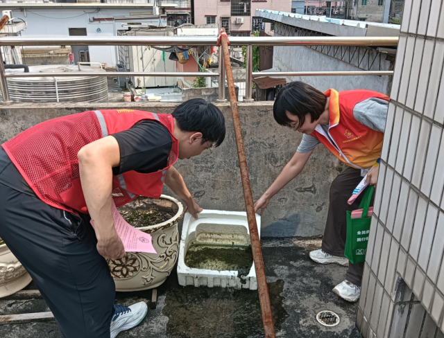 逢源社区楼栋规模与朝阳社区相近,通过“清积水、除隐患、广宣传”三管齐下,全力筑牢“双热”防控屏障。该社区租户多从事服务业,居家时间与社区工作人员工作时间高度错开,给入户宣传工作带来不小挑战。为破解这一难题,逢源社区工作人员先通过电话初步摸排住户情况,再针对性开展夜间入户宣传,同时积极发动屋主与二房东共同参与,形成“入户宣传、隐患整改、知识普及”的合力。