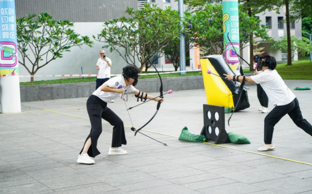 在“潮人三项”环节,大家踊跃参与攻防箭、飞镖、冰壶等运动,以体育为纽带,增进穗港澳三地青年的友谊,为迎接全运会营造良好氛围。