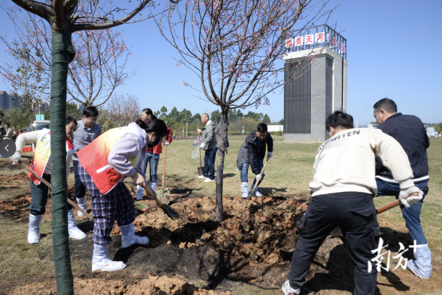植树活动现场,大家热情洋溢地参与其中,纷纷扶正树苗、挥锹挖坑、填坑夯苗、浇水定根,每道工序一丝不苟、认真细致,合力栽下花旗木、广州樱、宫粉紫荆、烟花树、茶花等开花树木约260株,以彩色“画笔”描绘美丽城市。