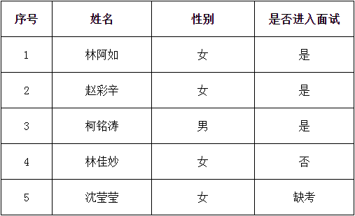 根据考生的笔试成绩由高到低顺序,确定面试考生名单如下:
