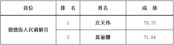 猎德街公开招聘人民调解员的笔试、面试已于2018年9月27日结束,根据考生报考岗位的笔试、面试的综合成绩由高到低的顺序,确定进入体检环节的考生名单如下: