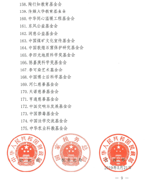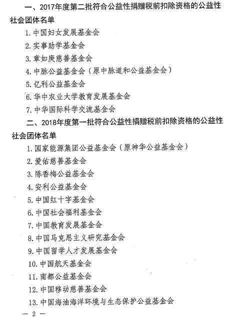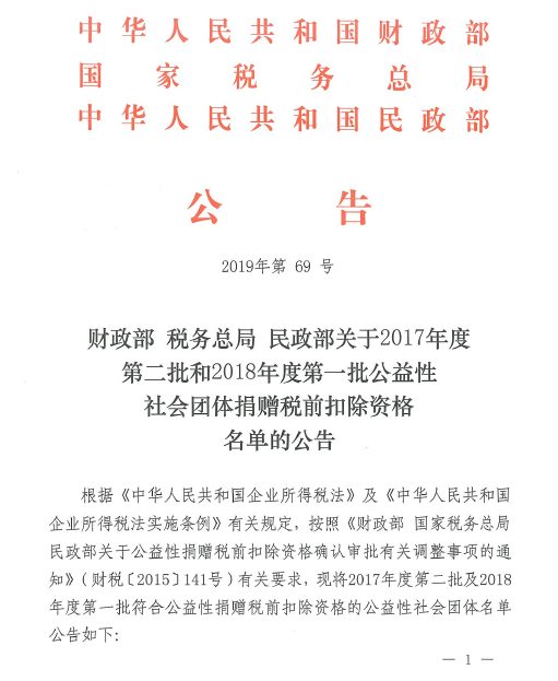 财政部+税务总局+民政部关于2017年度第二批和2018年度第一批公益性社会团体捐赠税前扣除资格名单的公告(2019年第49号)