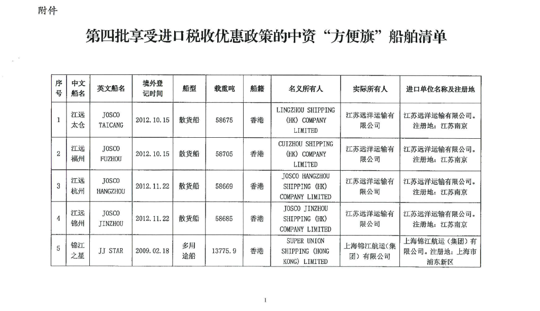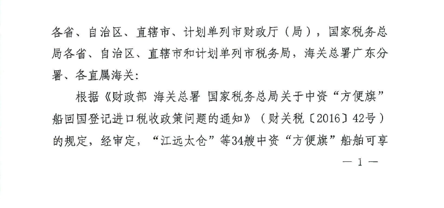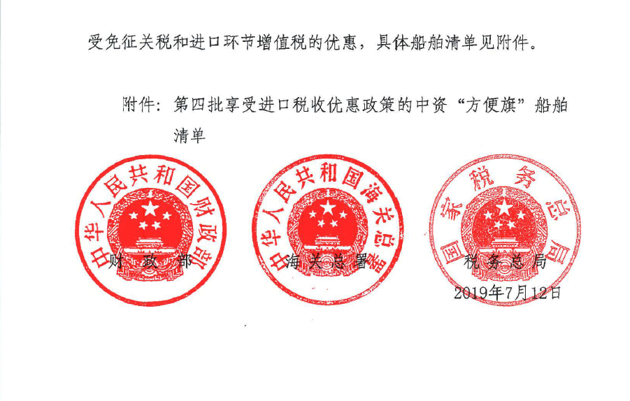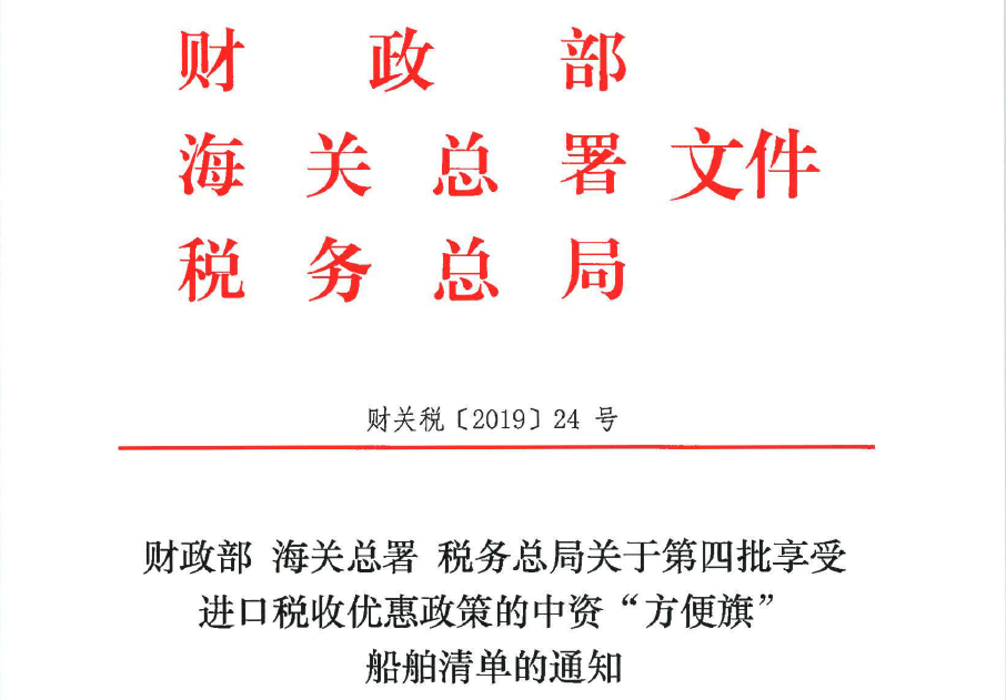 财政部+海关总署+税务总局关于第四批享受进口税收优惠政策的中资方便旗船舶清单的通知(财关税[2019]24号)