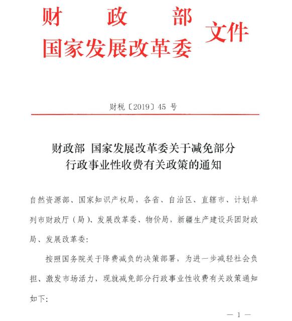 财政部 国家发展改革委关于减免部分行政事业性收费有关政策的通知(财税〔2019〕45号)