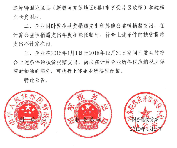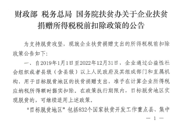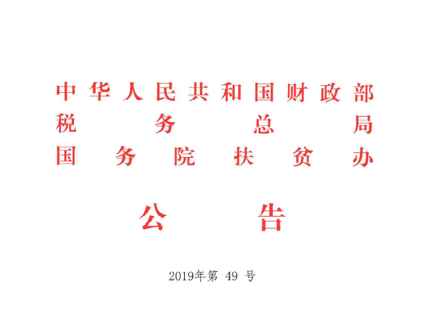 财政部+税务总局+国务院扶贫办关于企业扶贫捐赠所得税税前扣除政策的公告(2019年第49号)