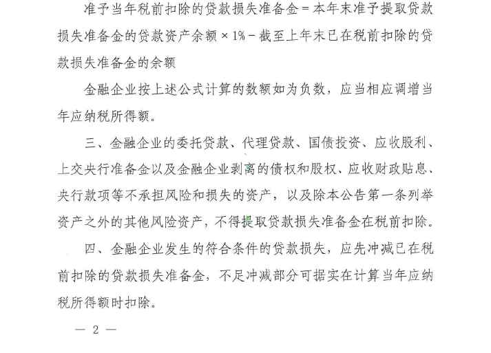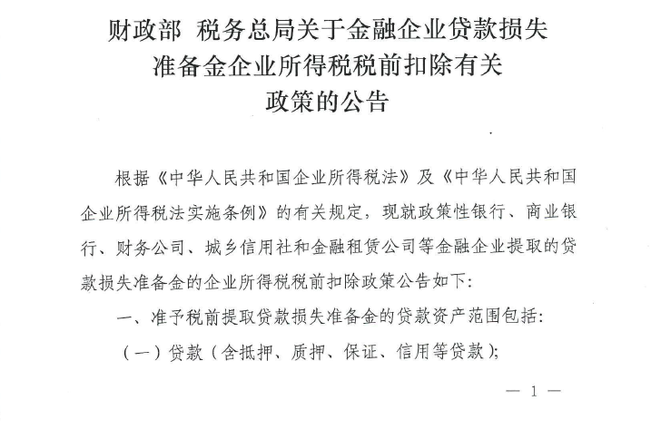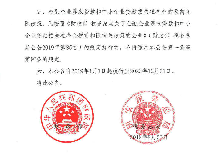 财政部+税务总局关于金融企业贷款损失准备金企业所得税税前扣除有关政策的公告(2019年第86号)