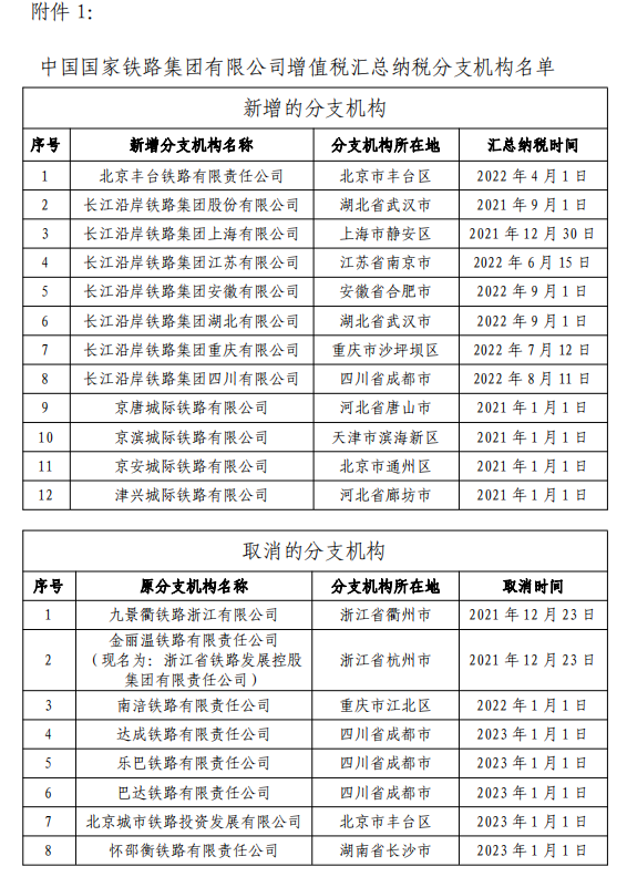 1.中国国家铁路集团有限公司增值税汇总纳税分支机构名单