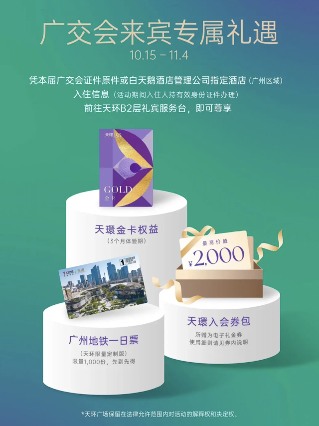 天环广场设置广交会来宾礼遇,10月15日—11月4日凭本届广交会参会证件或白天鹅指定酒店入住信息,到商场B2层礼宾处即可享受天环金卡会员权益 。