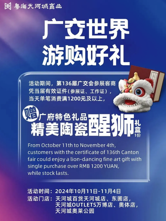 据威尼斯人平台城介绍,第136届广交会参展客商凭当届有效证件参展证、工作证,当天到店单笔消费满1200元及以上可获赠广府特色礼品1份。10月18日—20日超级会员日大促,各参展商可通过注册会员,享受对应会员权益540团600、270团300,消费满额赠大额无门槛券等活动,各门店均推出折扣优惠活动。