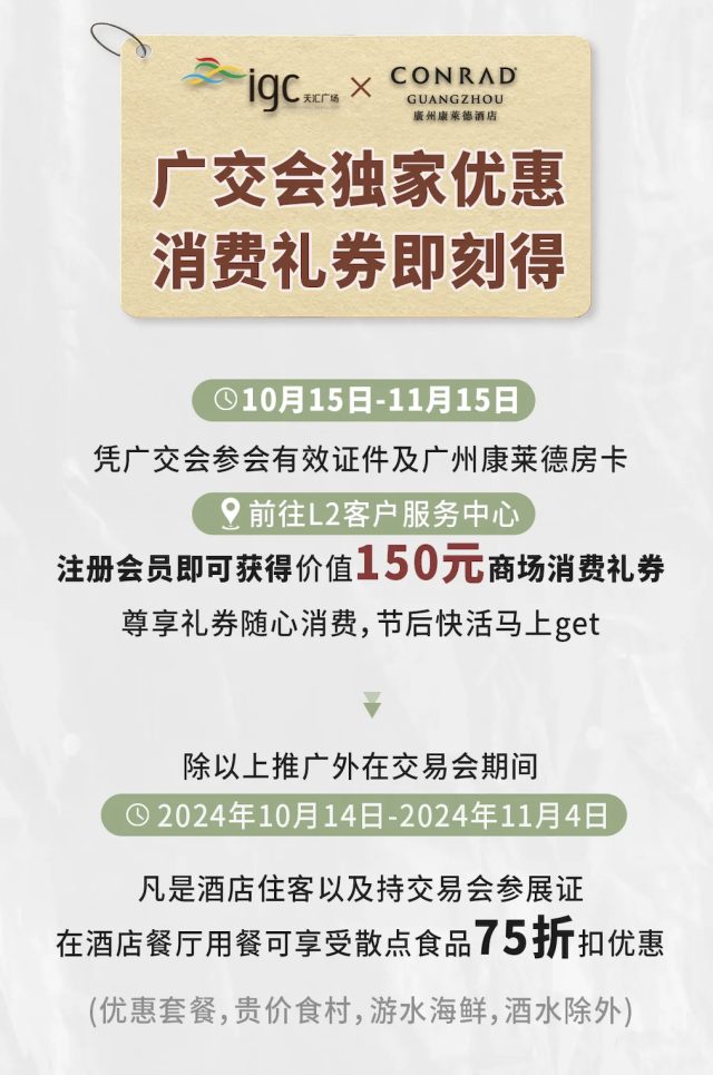 同时,设置康莱德酒店住客限定礼遇:小程序注册成为igc会员,即可获赠igc150元消费现金券包。凭康莱德住房卡可免费于指定地点乘搭往来igc及广交会穿梭巴士。