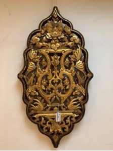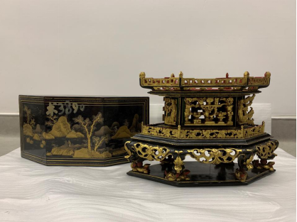 潮州金漆木雕,唐代兴起,明清时繁盛,由潮汕地区宗族祭祀盛行,通常用于祭祖、游神、婚嫁等活动。潮州木雕选材考究、造型奇巧、雕工精细。综合运用浮雕、圆雕、镂雕、金漆线描等工艺,构图复杂,层次分明,应用中国传统绘画的散点透视技法;有历史典故、戏曲人物、花鸟瑞兽等题材。