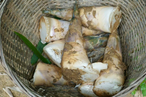 拍干净笋身上的泥土,琥珀色的外衣便完全显露出来,笋呈锥形,大约20-30厘米长,头部尖,尾部有几圈纹路,散发着丝绸般的质感,光亮诱人。吊丝丹笋可以鲜吃,剥开脆脆的外皮,咬上一口鲜笋,爽脆、鲜甜、且无渣。