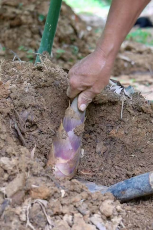 在竹的旁边,松软的土包微微隆起,那大概率就是有笋的。黄淦芳用手轻轻拨开土,见到一点儿笋尖冒出,动作就迅速利索起来,刨土、下铲、用力一推……一把将笋铲出来。笋一见阳光就会发苦,整个过程必须一气呵成。