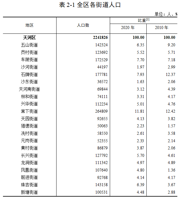 与2010年第六次全国人口普查相比,21个街道人口均增加。人口增长较多的5个街道依次为:珠吉街道、凤凰街道、棠下街道、车陂街道、长兴街道,分别增加90606人、88106人、86945人、69742人、61694人。