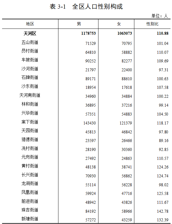 根据第七次全国人口普查结果,现将2020年11月1日零时我区21个街道的人口性别构成情况公布如下: