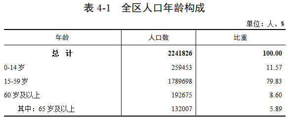 全区常住人口[2]中,0-14岁[3]人口为259453人,占11.57%;15-59岁人口为1789698人,占79.83%;60岁及以上人口为192675人,占8.60%,其中65岁及以上人口为132007人,占5.89%。与2010年第六次全国人口普查相比,0-14岁人口的比重提高1个百分点,15-59岁人口的比重下降2.33个百分点,60岁及以上人口的比重提高1.33个百分点,65岁及以上人口的比重提高1个百分点。