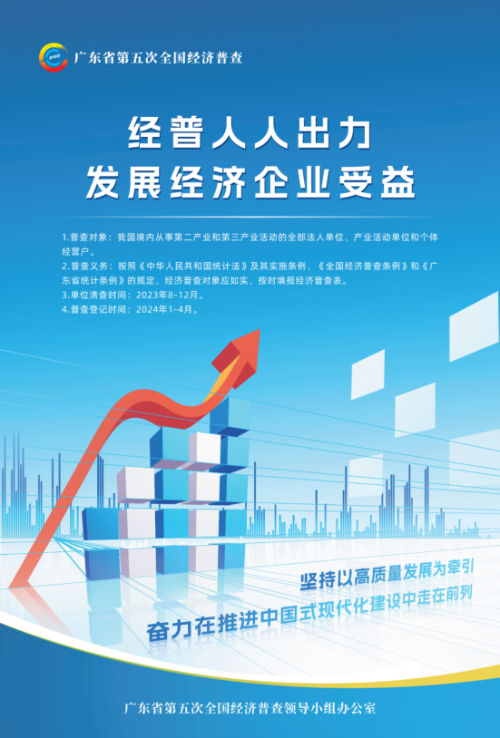 第五次全国经济普查是在全面建成社会主义现代化强国、实现第二个百年奋斗目标新征程上的重大国情国力调查,也是党的二十大胜利召开后的首次大型普查。在新的历史起点上,广东面临新形势新任务新要求,肩负着走在前列的使命任务。组织做好经济普查工作,对于摸清新时期广东经济社会发展“家底”、掌握广东奋进新征程所具备的基础和优势、查找广东推进现代化建设存在的差距和不足、助力推进中国式现代化的广东实践,实现经济质的有效提升和量的合理增长,奋力在推进中国式现代化建设中走在前列具有十分重要的意义和作用。