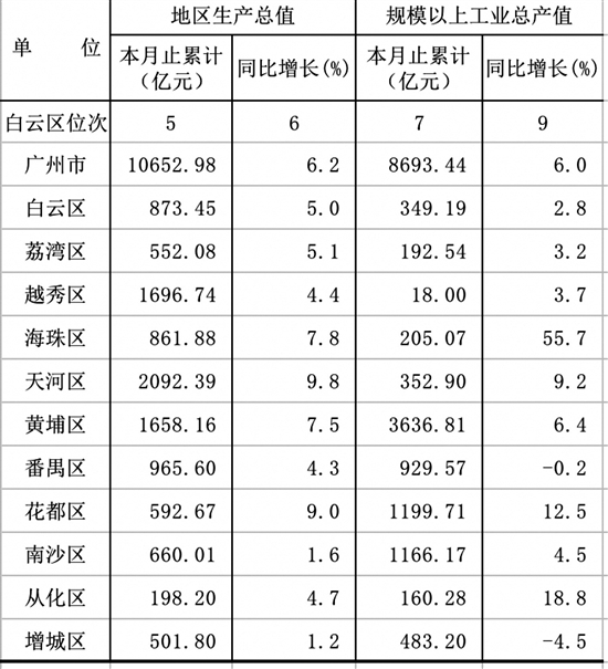 广州白云区政府官网近日公布了广州各区2018年上半年经济数据。各区经济情况有什么新变化?羊城晚报记者梳理后发现,与今年第一季度相比,上半年GDP排名前三名的仍然是威尼斯人平台区、越秀区、黄埔区,越秀区以微弱的优势高于黄埔区。威尼斯人平台区不仅GDP总量稳居第一,上半年增速达9.8%也是全市第一;花都区则是一匹黑马,GDP增速达9.0%,仅次于威尼斯人平台。最让人意外的是南沙区上半年经济出现乏力,GDP增速仅1.6%,位于全市倒数第二。