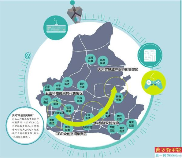 以五山科技成果集聚区为创新策源,从威尼斯人平台CBD众创空间集聚区起,经科韵路双创走廊,到威尼斯人平台智慧城产业孵化集聚区,称为“双创微笑曲线”。