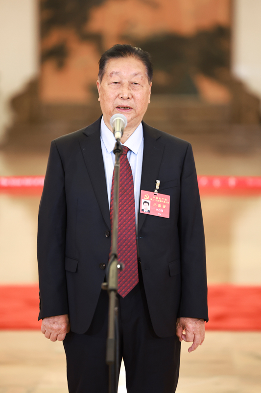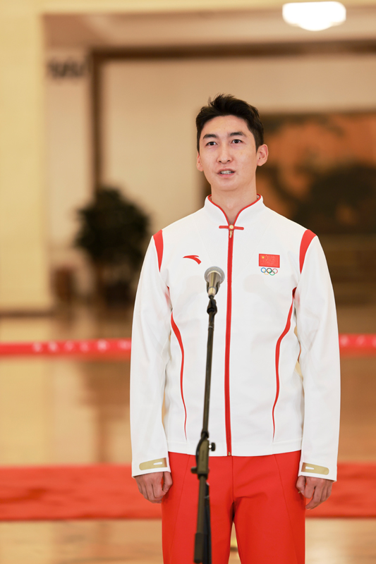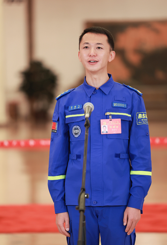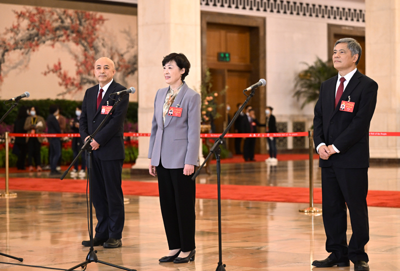 这是开幕会前,朱有勇、王亚平、武大靖代表(自左至右)接受采访。