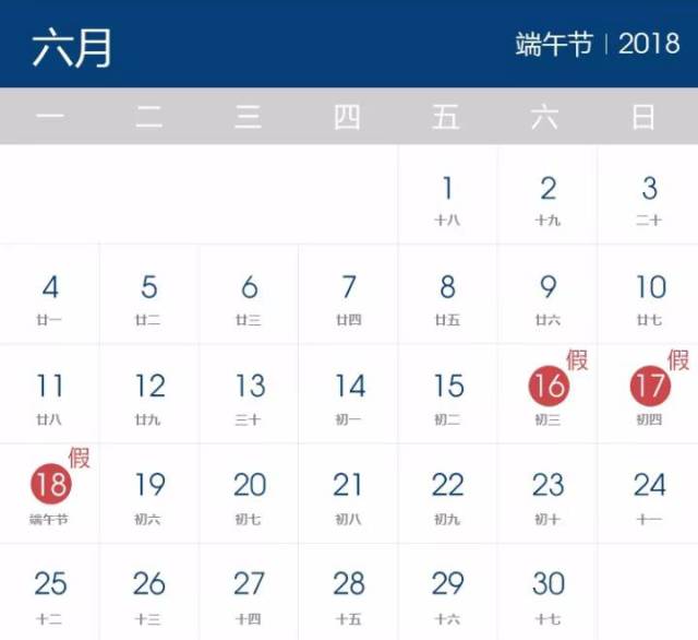 2018年6月16日(星期六)至2018年6月18日(星期一)放假,共计3天。6月15日(星期五)对外服务至下午15点。