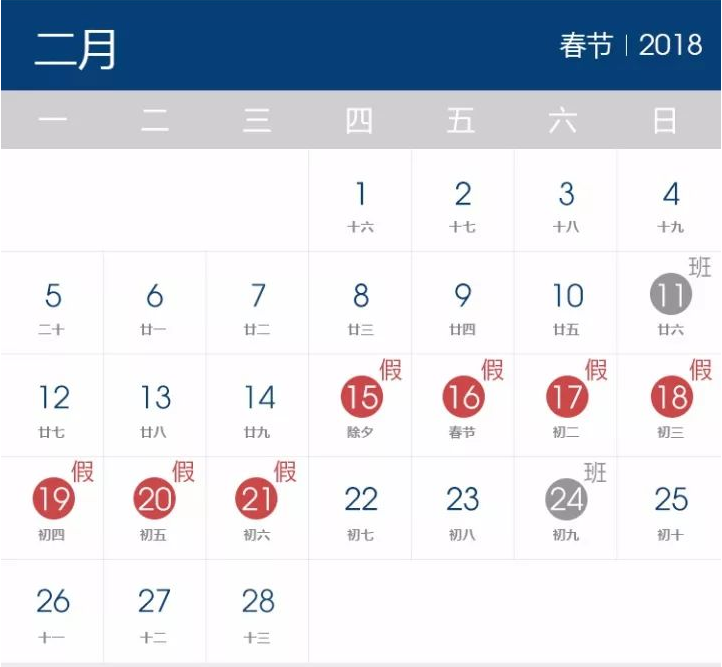 2018年2月15日(星期四)至2月21日(星期三)放假调休,共计7天。2月11日(星期日)、2月24日(星期六)上班。2月23日(星期五)对外服务至下午15点。